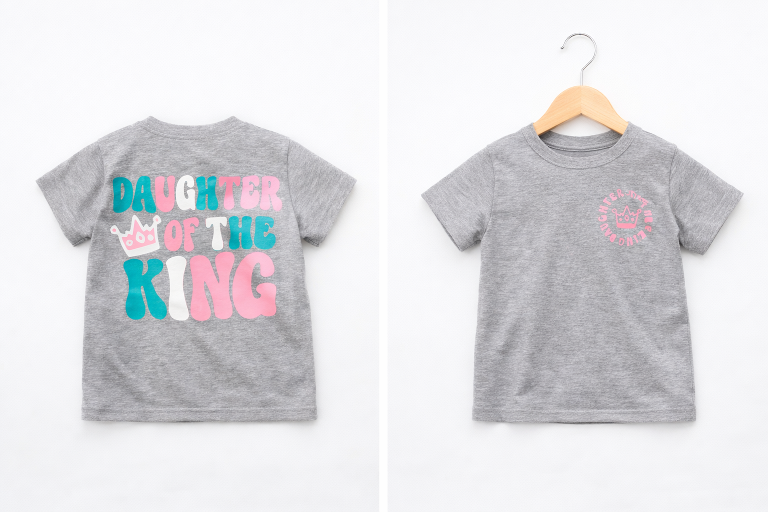 This handmade “Daughter of the King” shirt is created with layered heat-pressed vinyl for a vibrant, long-lasting design that stands out beautifully on soft grey cotton.