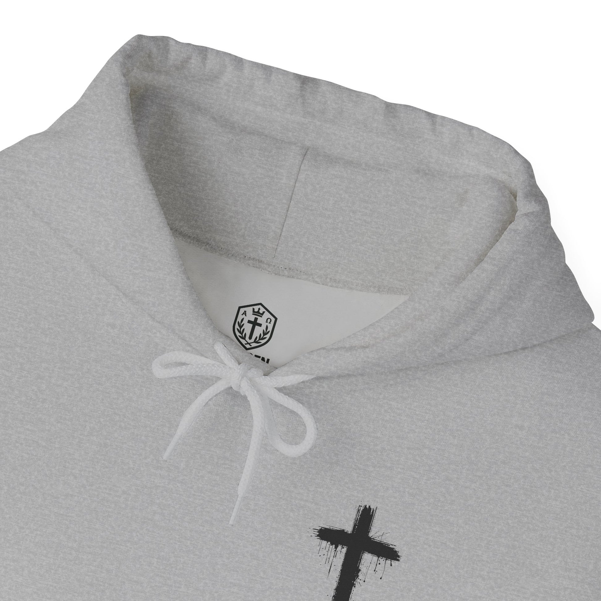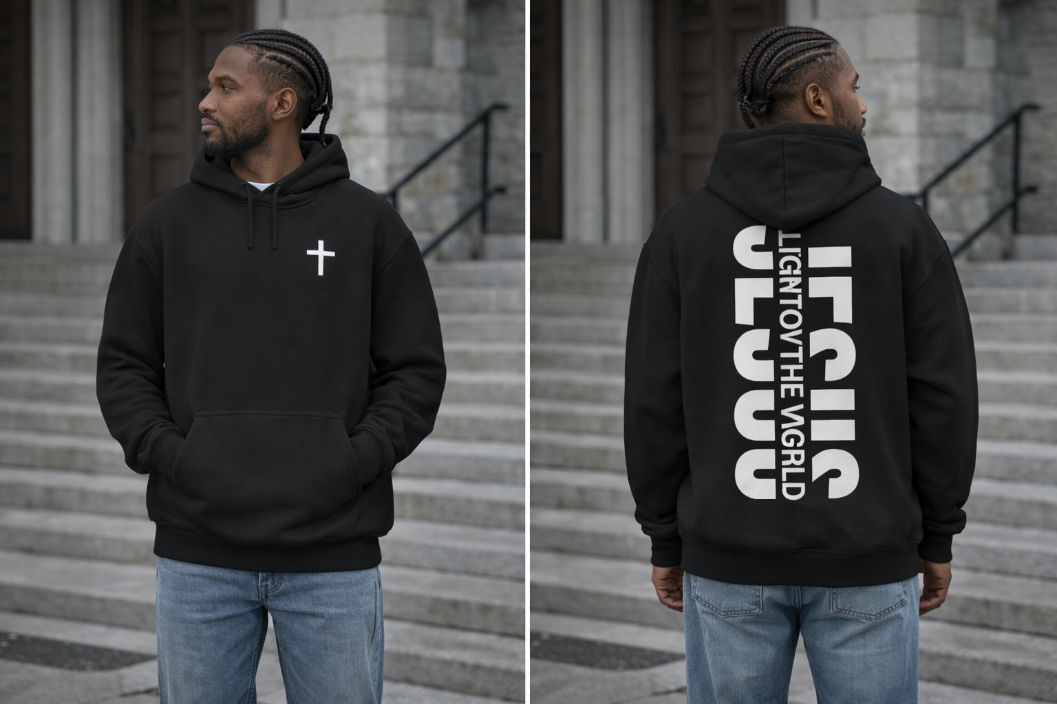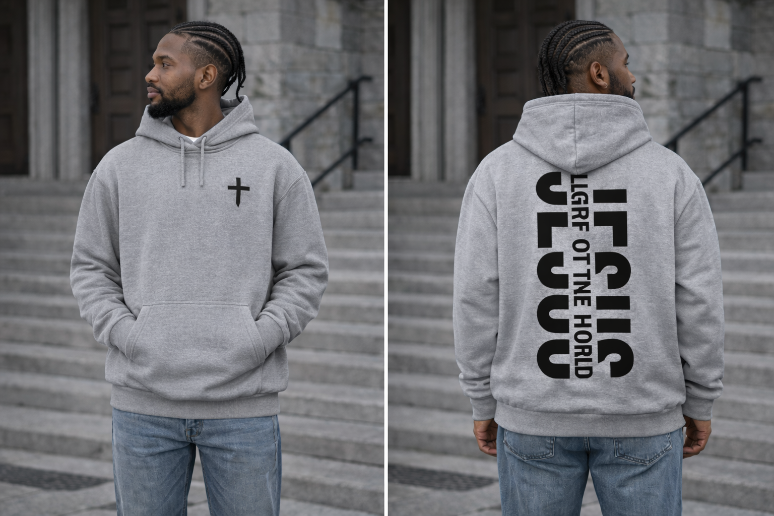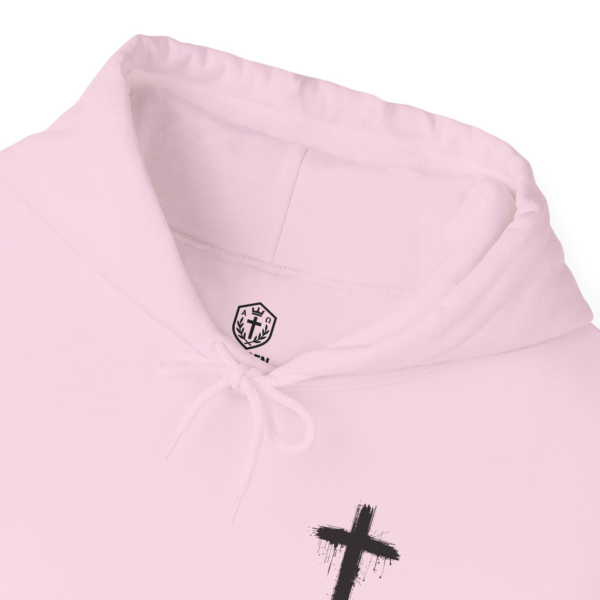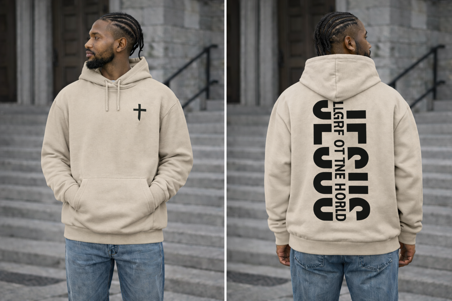 Soft, warm, and quietly expressive—this hoodie carries faith-forward details with a minimalist edge. A small embroidered cross sits over the heart, subtle and steady. On the back, bold vertical lettering reads a short, uplifting affirmation that catches the eye when you turn around. The roomy kangaroo pocket and double-lined hood make it an easy layer for cool mornings, late-night drives, or church gatherings. It feels like a wearable reminder: calm, confident, and rooted.